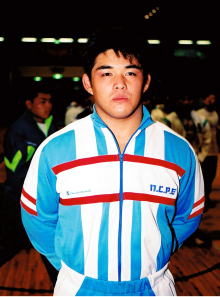 そして、大学時代にお世話になった指導者へも、その気持ちは忘れない。「藤本先生(英男=日体大部長)、安達先生(巧=日体大監督)、佐藤先生(満=専大コーチ)、西口先生(茂樹=拓大部長)…。皆さんが必死にやっているのに、自分が何もしないわけにはいきません」。だからこそ大会運営も必死にやった。選手の育成にも必死に取り組んでいる(右写真=1995年に全日本大学グレコローマン選手権82kg級で優勝した馬渕監督)。