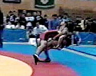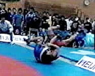 上記の連続写真の(1〜3)は赤が仕掛けた攻撃です。(3)で持ち上げタックルを狙っています。しかし、こらえられ、(4)の場面で両者の動きが一瞬ストップしています。その後、赤をかかえた青が後方へ投げました(5〜8)。