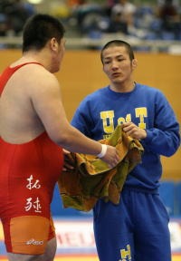 そこで奮起したのは重量級の伏兵たち。84s級では伊藤啓太が10月の全日本大学グレコローマン選手権(74s級)に続いて優勝。全日本学生選手権2位の山縣養一(日大)を破るなど内容もすばらしかった。96s級では藤本健治が決勝に進出し、斎川哲克(日体大)に敗れたものの得点を稼ぎ、120kg級は中村淳志が決勝戦でクリンチ勝負で粘って2年ぶり2度目の優勝を達成した(左写真)。