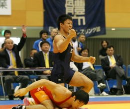 決勝戦の相手は拓大の米満達弘。本来なら66s級の選手だ。「対戦は初めてだったけど、(74s級でも)強いと聞いていた」と油断せず臨んだ。開始早々、米満が得意のタックルを仕掛けてくる。それをかわし、足をかけて足首をすくうタックルを出すと、米満は大きくバランスを崩し、背中から崩れ落ちた。そこをすかさず抑え、開始わずか1分でフォール勝ち(右写真)。大学主要タイトル初戴冠を最高の形で締めた。