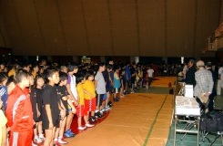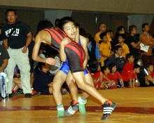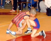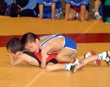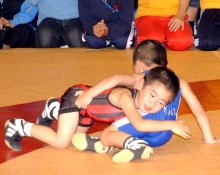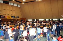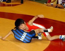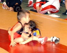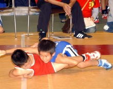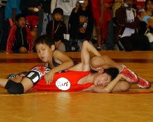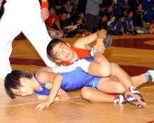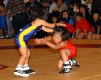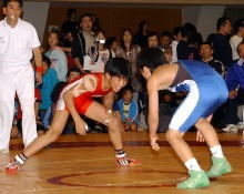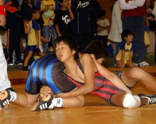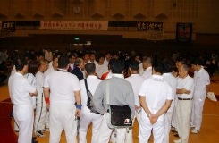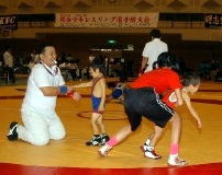 | 国際審判員も入れて35人の審判員が念入りにミーティング | 熱戦がスタート。どのマットも選手と保護者の熱気であふれた | 必死に闘う少女選手。見る方も力が入る | 試合放棄しようとする選手を保護者が必死に阻止! |