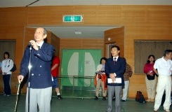 押立吉男大会会長(左=吹田市民教室)と寺内正次郎副会長(右=高槻連盟) | 選手宣誓は吹田市民教室の白石奈々子選手(左)と渡辺大貴選手 |