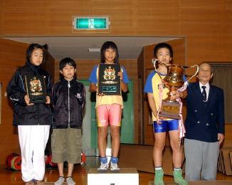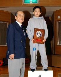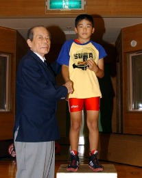 | 団体優勝の吹田市民教室(中央)と2位のゴールドキッズ(左) | 最優秀選手に輝いた渡辺大貴選手(5・6年35kg級) | 敢闘賞に輝いた乙黒拓斗選手(3・4年32kg級) |