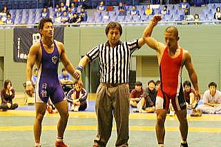 「前に出る力が強いし、ローリングも強烈で高校時代からずっと負けていました」と苦手な相手。ことしのインカレ、国体とすべて松本と対戦して敗北していた。その相手に対し、第1ピリオドに変形ガッツレンチで3点を奪い(左写真)、第2ピリオドはきっちり守ってストレート勝ち。「初めて松本選手に勝ちました」と、通算5度目の正直での勝利を挙げた。