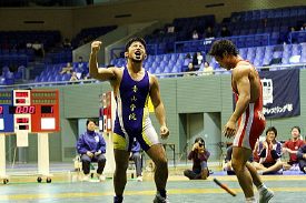 全日本大学グレコローマン選手権は10月18日、東京・駒沢体育館で開幕。軽量4階級が行われ、66kg級は昨年優勝の板倉史也(青山学院大)が学生王者の藤本浩平(拓大)を準決勝で破り、決勝で成瀬一彦(日体大)を破って2年連続優勝を達成した(右写真=決勝)。