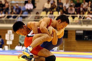 稲葉自身は準決勝の湯元戦に集中し、決勝のことは考えていなかったようだが、「斎藤選手とやりたかった」。決勝戦もタックルが要所で決まり、2ピリオド連取の快勝(右写真=赤が稲葉)。斎藤が地元・秋田出身の選手ということもあって、会場からはため息がもれ、ヒール(悪役)になってしまったが、「これで北京五輪を狙える。国体優勝を励みにしていきたい」とうれしさを隠さず笑顔を見せた。