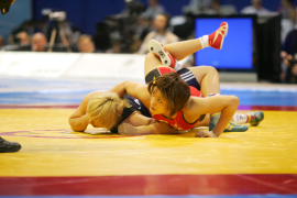 | 【4回戦第1P】過去負けたことのある宿敵と4度目の対決(青が伊調)。 | 【4回戦第1P】伊調が正面からタックルを決めて2点を先制。 | 【4回戦第3P】42秒にテークダウンを奪い、貴重な1点を取った。 |