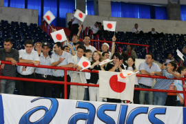 | 【決勝第2P】勝ち名乗りを受けた時、一瞬目頭がゆるんだ。 | 【決勝後】昨年と同じく栄和人監督と木名瀬重夫コーチが祝福。 | 【決勝後】この日も応援席には在留邦人の人たちの応援が。 |