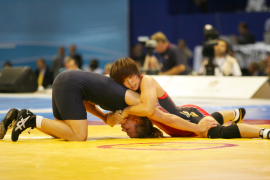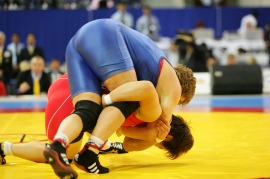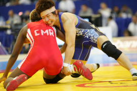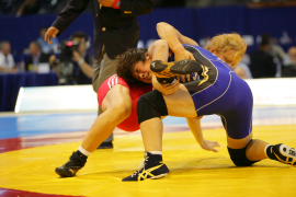 | 【2回戦第1P】宿敵の1人、マクマン相手に1点を先制した伊調(青)。 | 【2回戦第2P】相手のタックルをかわしてバックへ回り、押しつぶして1点。 |