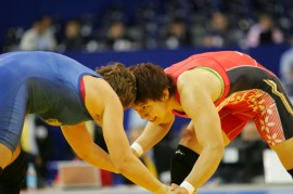 《経過》第1ピリオド、やや慎重で攻撃できなかった浜口だが、1分26秒にタックルから場外へ押し出して1−0。直後にも場外へ出して2−0。終了間際に1点を取られたが、2−1で終了。第2ピリオドは29秒にテークダウンを奪って1−0とし、そのスコアを守った。