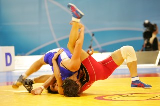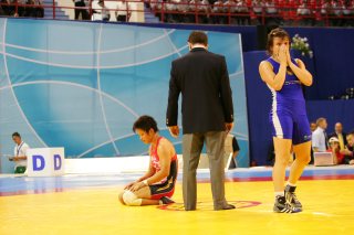 正田は必死になってタックル返しを狙い、相手の体を返したかに見えたが(右写真=赤が正田)、「体が完ぺきに死んだ状態」(金浜コーチ)との理由で、攻撃側のテークダウンが有利。相手のポイントとなり、正田の敗戦が決定。そのシニシンは、正田戦からわずか15分後に行われたフランス選手にあっさりとフォール負けし、敗者復活戦へ回ることのない3回戦敗退となった。