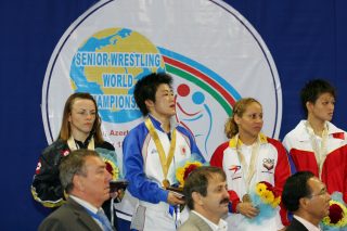 今大会で初となる「君が代」が広い会場中に響きわたった。その音に涙を流し、日の丸を見つめていたのは女子フリースタイル48kg級の伊調千春(ALSOK綜合警備保障=右写真)。準々決勝で開催国アゼルバイジャンのマリア・スタドニクに予想外に苦戦を強いられた。しかし続く中国を2−0(1-0,1-0)で倒して決勝へ。