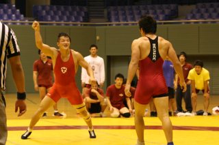 光ったのは74kg級の山名隆貴(左写真)の成長だった。勝負どころの3試合に出場し2勝1敗。敗れた1敗は拓大の米満達弘が相手で、敗れはしたが米満を苦しめさせて拓大の勢いを断ち切った。早大との決勝戦では2勝1敗の状況で出番が回った。相手はインカレ74kg級3位の武富隆だ。