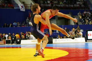 2回戦は、今年8月の「ニコラ・ペトロフ国際大会」で敗れたエフゲニー・ポポフ(ロシア)が相手。ピリオドスコア1―1で迎えた大事な局面でもポポフに持ち上げられ、体が宙に浮いた。だが、ぎりぎりでこらえ、がっちりと胸を地面につけ直して勝利を死守(左写真)。「中途半端に守ったら返される」と今夏から外人対策に着手。1階級上の松本慎吾(一宮運輸)に積極的に挑む練習が功を奏した。