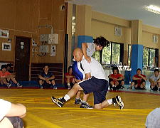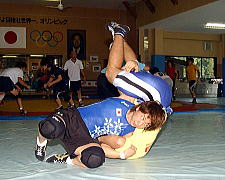 ライバル、ズラテバ(ブルガリア)の得意技を練習する浜口京子。 |