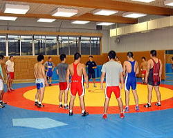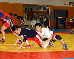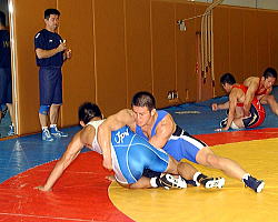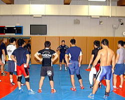 | 合宿開始。富山英明強化委員長からゲキが飛んだ。 | 和田貴広コーチの技術指導を受けるフリースタイル・チーム。 | グレコローマンは伊藤広道コーチが熱烈指導。 |