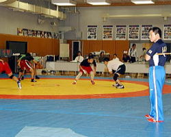 | 練習中の大半をマットに立っていた富山強化委員長。手には根性棒。 | けがのため遠征不参加だったの松永共広(フリー55kg級)も元気に参加。 | 前日に帰国した松本慎吾(グレコ84kg級)も周囲に熱気に本気モード。 |
