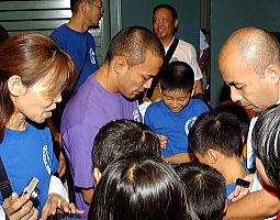 KID選手は1982年の全国少年大会(この大会の前身の大会)の幼児の部に出場し、連盟設立後の1984年第1回大会(茨城・高萩市)から88年の新潟大会まで出場していた。「自分の出ていた時のことを思い出しますね」と感慨深げ。出場選手は第1回大会(382選手)の約3・8倍、最後の出場となった第5回大会(696選手)の2・1倍に膨れ上がった。「大きな大会に成長しましたね。このまま伸びてほしいです」よ、キッズレスリングのいっそうの発展を願っていた。(左写真=多くのファンからサイン攻めにあうKID選手)