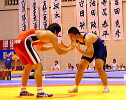 敬志さんも中学卒業と同時に親元を離れてレスリングに打ち込んだ人間。父親譲りの独立心と言えるわけで、「自立心がついたのが、この成績につながったんじゃないかな」とも言う。自らはインターハイで「団体戦3位、個人戦ベスト8」の成績だったそうで、「ボクを上回りましたね」と、うれしそう。(右写真=優勝した山口相手に、クリンチからのタックルでピリオドを取る。山口がピリオドを落としたのはこの試合だけ)
