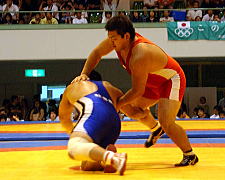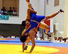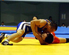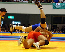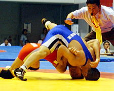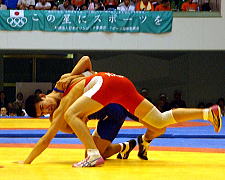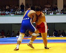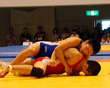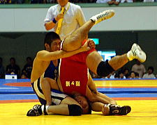 | 第1ピリオドを取った桑原(青)は第2ピリオド、通称牛殺しのような投げ技(右写真)でフォール勝ち。秋田商が王手をかけた。 | |