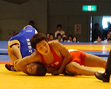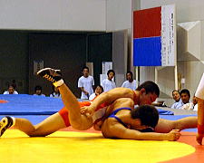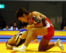 | 開始早々に水越(赤)がニアフォールを奪い(左写真)優位に。第1、2ピリオドとも終始攻勢をとって霞ヶ浦が先勝。 | |