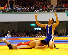 | 佐藤(青)は第2ピリオド、タックル返しで3点をリード(左写真)。しかし3−1とされ、ラスト5秒にがぶり返しを受けてしまって(中写真)勝利を逃す。和田(赤)の執念だった。しかし第3ピリオドをしっかり勝ち、秋田商が4勝目。勝利が決まると両人差し指を上に向けて天を仰いだ(右写真)。 | ||