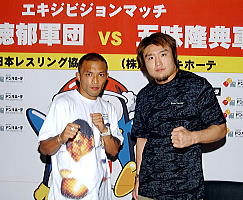 中量級の総合格闘家として日本の雄を争う2人だが、闘う団体が違うため、プロのリングでは闘う可能性はない両者。しかし、レスリングの盛り上げという形で顔を合わせた。どことなく緊張感の張り詰めた中で行われた会見だが、KID選手が「五味軍団と闘う機会をつくってくれたことに感謝したい」と話し、五味選手は「これまでKILLER BEEとは接点がなかった。これを機に交流していきたい」と、友好ムードも。最後はきちんと握手をして分かれ、当日の健闘を誓い合った。