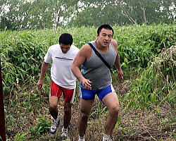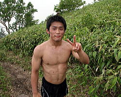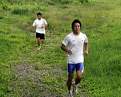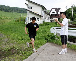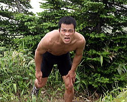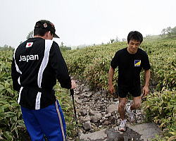 | 登りではトップをキープしこの笑顔だったが、その後転んでしまって総合成績は2位の日体大の富岡直希。 | 登りは2位ながら、帰りで踏ん張り、総合を制した自衛隊の谷岡泰幸。写真は登り時に必死で富岡を追っているところ。 | ジョギングで登山しているところを富山委員長に見つかり、「ダッシュだ!」と愛のムチを受けたフリー66kg級の鈴木崇之。 | ひざの具合が悪いものの、できる力を振り絞って登るフリー55kg級の松永共広。 |