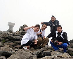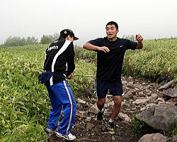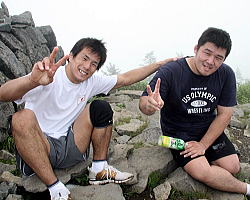 | 休憩なしで歩き続け、1時間30〜40分で頂上に到着した4人。車で距離を稼いだのがあたり、先発隊より早かった。 | この勢いで世界の頂上も制す! フリー60kg級の湯元健一(左)と同96kg級の米山祥嗣。 | 先発隊の中間くらいで頂上到達のグレコ96kg級の加藤賢三。すぐ後ろには先発隊のトップが迫っていた。 |