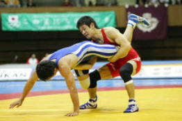 フリースタイル55kg級は2005年世界5位の松永共広(ALSOK綜合警備保障)が世界選手権代表の座を奪還した(右写真:決勝で田岡を下した松永=赤)。