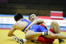 グレコローマン55kg級は豊田雅俊(警視庁)が勝ち、アテネ五輪を含めて5年連続での世界大会出場を決めた。(写真上下:平井と闘う豊田)