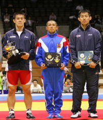 まずグレコローマン7階級の見どころを探ってみた(★は全日本選手権の優勝選手。右写真は、昨年の大会で明治乳業杯を受賞したグレコローマン84kg級・松本慎吾選手=左と、フリースタイル最優秀選手の55kg級・田岡秀規選手=中、グレコローマン最優秀選手の74kg級・菅太一選手)。