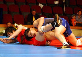 前日、浜口京子と吉田沙保里が実力の違いを見せつけて金メダルに輝いたのを見て、「自分も」との思いを強めて臨んだ1回戦。相手は中国のヤン・センリアン。第1ピリオド、1点をリードされた展開から、1分55秒に執念のタックルを決め(右写真)、2−1と逆転。だが第2ピリオドを0−4で落とし、第3ピリオドもローリングなど受けて全く攻め込めずに0−7。ピリオドスコア1−2で敗退した。