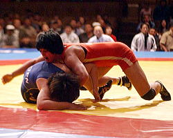 「実力が競っていて、1点勝負となる相手なら、それでもいい。実力差がある相手に対して、1点ずつ取る闘いでは駄目。倒して一気にフォールに持っていかなければ駄目なんだ」と栄監督(左写真=テークダウンを取り、一呼吸おいてしまう新海)。期待があるだけに、一見すると圧勝と思える銅メダル獲得にも、厳しいゲキを飛ばした。