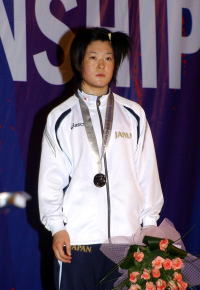 2005年のアジア・ジュニア選手権でチャンピオンに輝いている51`級の柴田瑞穂(中京女大)が、シニアでのアジア・チャンピオンを目指したが、あと一歩及ばず、銀メダルに終わった(右写真=満足そうな表情のない表彰台での柴田)。