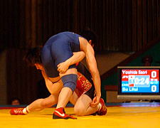 《経過》第1ピリオド、吉田はタックルで1点を取り、ニアフォールへ追い込んで5秒以上押さえて4−0へ。後半、相手のタックルを回りこんで1点を加えた。第2ピリオドはタックルをがぶられ、がぶり返しを受けてしまったが、すぐにバックを取り返して1−2へ。中盤、3点のタックルを決め、最後にもタックルで場外へ出して5−2として勝った。