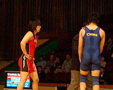 《経過》第1ピリオドは0−0で、コイントスで勝った浜口がテークダウンを決めた。第2ピリオドも0−0で、コイントスで王旭が攻撃権。浜口は粘ってまだ失点とは思えなかったが、レフェリーにあっさり1点を入れられ、ピリオドスコア1−1のタイへ。