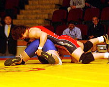 | 【決勝第1P】序盤から吉田(赤)高速タックルがさく裂。フォールの体勢へ追い込んだが、惜しくも逃げられる。 |