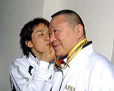 【試合後】金メダルを間にはさんで、父にキッス。 |
