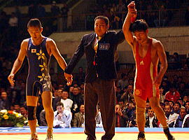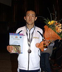 日の丸を胸に、さらには両足のシューズにもつけた大館信也(自衛隊)が、決勝で地元キルギス期待のバザル・バザルグルエフに敗れたものの、日本人選手大会第1号となるメダルを獲得した(右写真)。