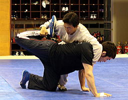 北京五輪を見据えて、6月9〜10日の明治乳業杯全日本選抜選手権(東京・代々木第二体育館)にも照準はしっかり合わせるつもりだが、専大のキャプテンとして母校に錦も飾りたい。あまり多くを語らない稲葉主将だけに、言葉少なに語る一言一言に、リーグ戦で優勝したいという気持ちが十分に表れていた(右写真:チームのキーパーソンとなる細越とスパーリングをこなす稲葉=下)。