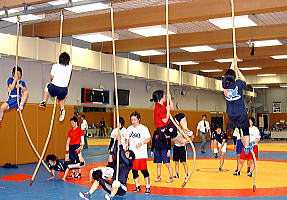 | 今年度最初の全日本合宿がスタート。5月からは新潟・十日町での合宿。 | ジュニア世代期待の星、三村冬子(左)が参加。吉田沙保里に挑んだ。 | 体力づくりの練習も十分に。激戦の11日後とはいえ、熱の入った練習が行われた。 |