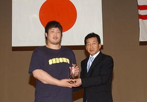 JOC杯ジュニアオリンピック最終日は4月22日、神奈川・横浜文化体育館で男子の決勝までが行われ、ジュニア・フリースタイル120kg級で荒木田進謙(専大)が3年連続優勝を達成。男子全部門の中の最優秀選手に与えられるJOC杯を受賞した(右写真=日本協会・高田裕司専務理事からJOC杯を受賞する荒木田進謙)。