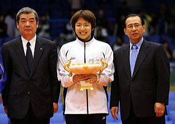 ジャパンビバレッジ杯は浜口京子が受賞(右写真)。最優秀選手に与えられるクイーンズカップは伊調馨、優秀選手賞は吉田沙保里、敢闘賞は伊調千春が、それぞれ受賞した。