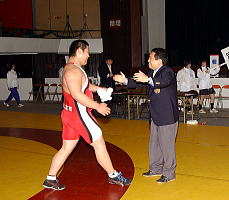 多くの改革を後輩に託すことになるが、「これだけは続けてほしい」と思うのが、一人の人間が委員長の座に長々と居座ることなく若手にどんどんバトンタッチしてほしいこと。自ら「2期4年」と決め、未練を持たずに委員長の座を譲ったのは新陳代謝を促すためで、「新しい審判委員会には30代の審判も入りました。若い力で高校レスリング界を盛り上げてほしい」とエールを送った(左写真=優勝した増田選手を迎えた斎藤委員長)。