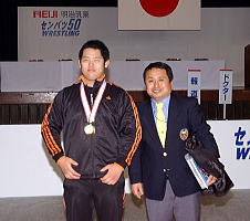 そんな斎藤審判委員長の顔に、全国高校選抜大会最終日の個人戦の最後の試合が終わったあと、「最後に一番の思い出ができたよ」と最高の笑みが浮かんだ。120kg級の決勝戦で、教え子の増田拓也選手が谷田昇大選手(奈良・大和広陵)に逆転勝ちし、優勝を成し遂げたからだ(右写真=増田選手と斎藤委員長)。