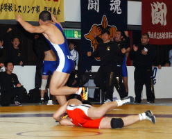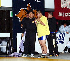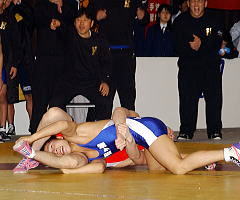 森内和也(霞ヶ浦)と菊地匠(秋田商)の1点をめぐる緊迫した攻防。4分間を闘って森内の勝利が決まると、大沢友博監督はコーチのみならず、選手達とも抱き合い、喜びを表した。