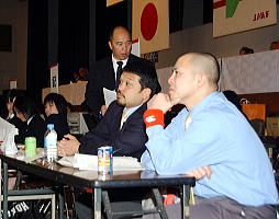 巻農高卒業の林監督だが、出身は白根。レスリング不毛の地だったが、2009年にはまさに地元の白根で国体のレスリング競技が行われることになり、レスリングを根付けたいという気持ちも頑張れる要因だ。もちろん、故郷・新潟のレスリングの発展を狙う気持ちも強い(左写真:監督が終わったあとは、着替えて競技役員へ=中央=。新潟県の監督は1人2役をこなす)