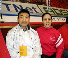 「なぜ女子は参加してくれないの? 私たちは日本を目標にがんばっているのよ。来年はぜひ参加して」(ペルシン・ウルン・コーチ=2002年世界選手権51kg級6位)と訴えるなど、実力アップに余念がない(右写真=ウルン・コーチ。左は男子フリースタイル全日本チームの和久井始監督)。