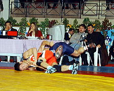 第1ピリオドは首投げで3点を先制し(右写真)、3−2とリードしながら、終了と同時にがぶり返しを決められての逆転負けだった。時計とマットの両方が見える位置にいた和久井始監督(自衛隊)によると、「時計が0になってから長島の体が回転した」とのことだが、試合の流れとしては絶対にこらえなければならないケース。